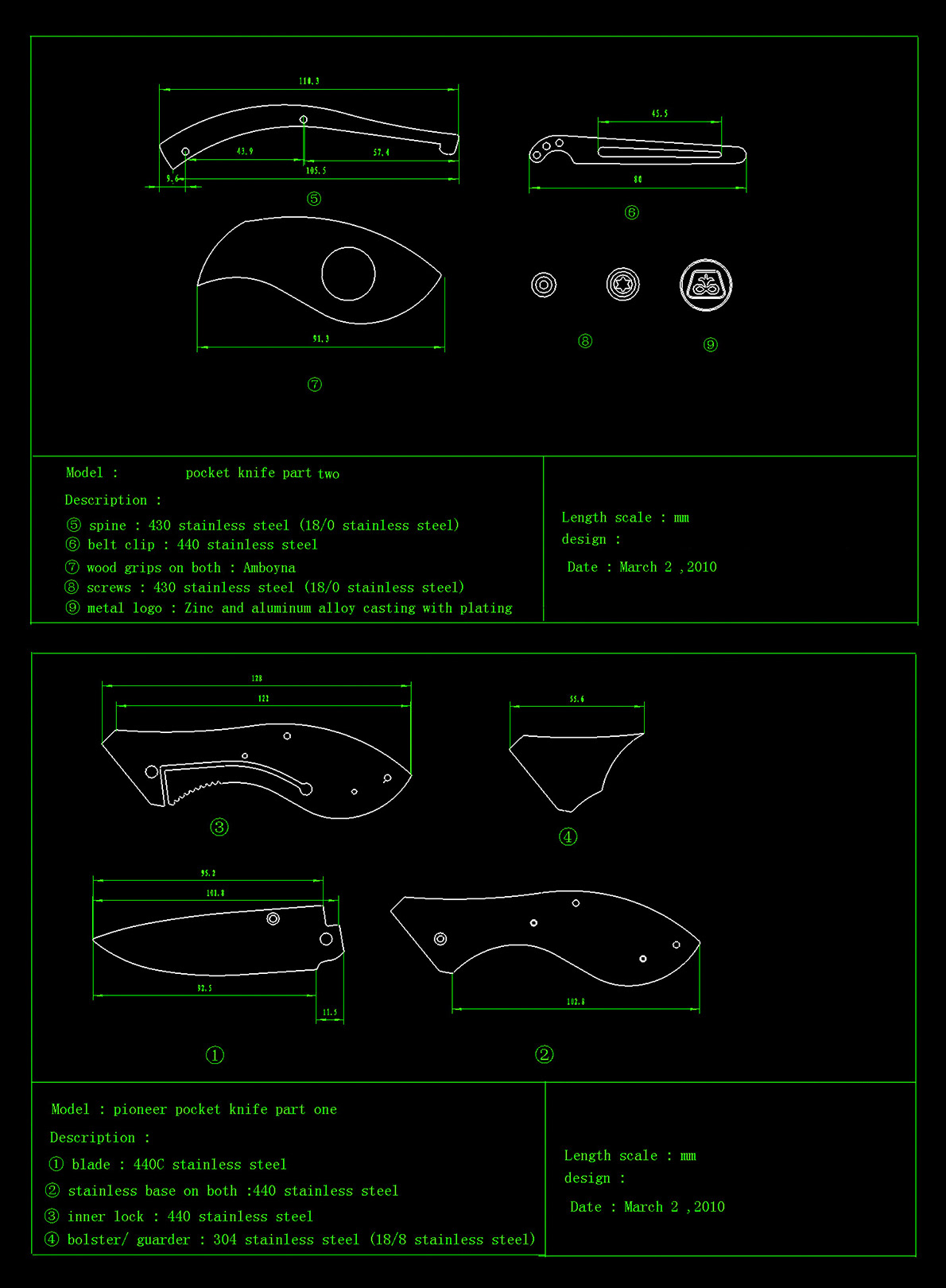 My initial sketches of the folding knife (above) and computer aided drawings made submitted by the factory (below).