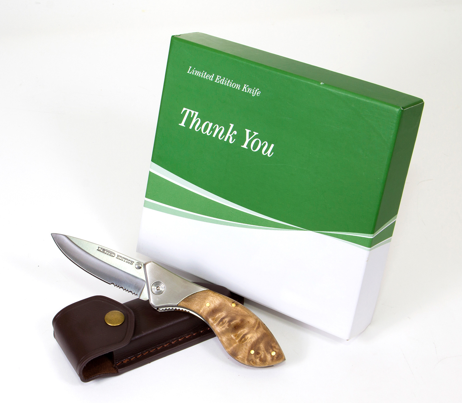 The client wanted a cost-effective solution with a high perceived value that would have a practical application for their customers. Weather stations, rechargeable lamps, working knives and various tools were among the Gloso recommendations. A limited edition folding knife was the final selection. From the high-grade stainless steel, to the imported Amboyna wood handle, intensive research was done to make sure the very best components were used in the product.